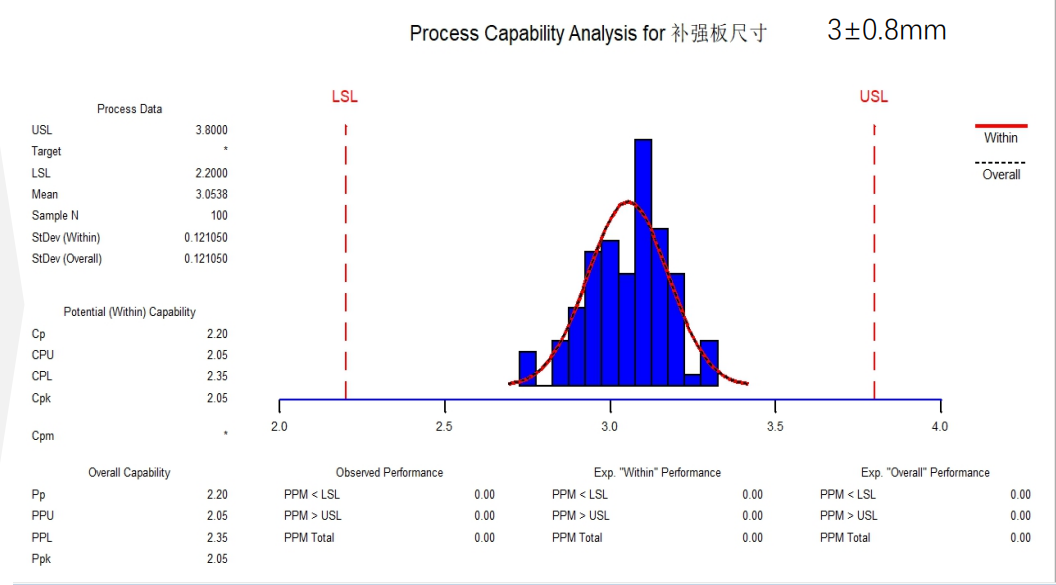 整體能力:Pp 2.2,PPU 2.05,PPL 2.35,Ppk 2.05。