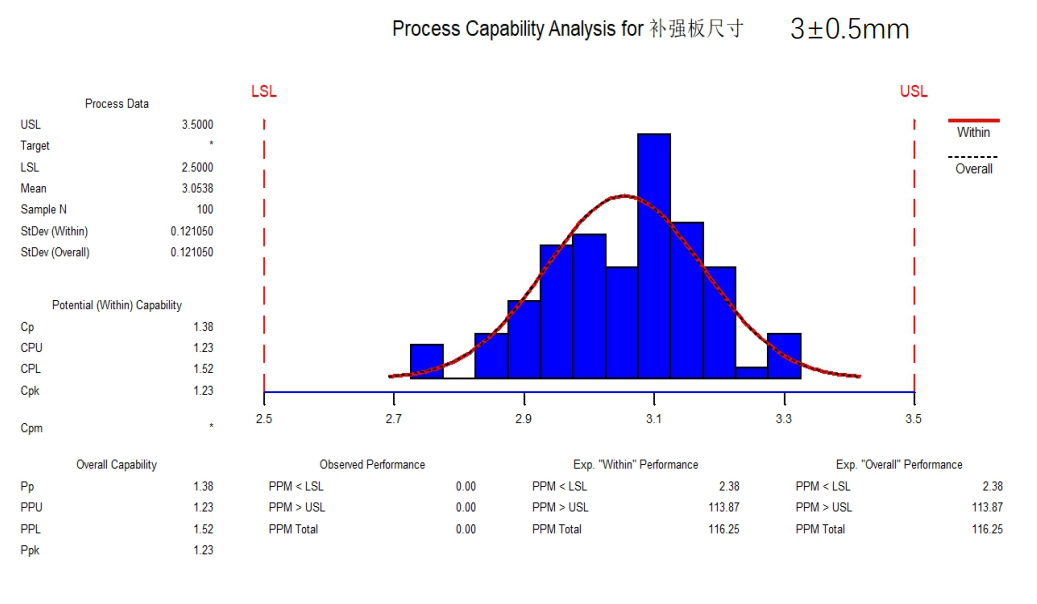 潛在的(內部)能力:Cp 1.38,CPU 1.23,CPL 1.52,Cpk 1.23。