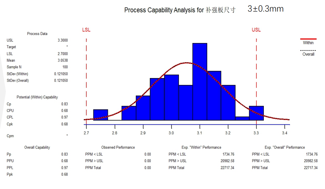 潛在的(內部)能力:Cp 2.2,CPU 2.35,CPL 2.35 Cpk 2.05。